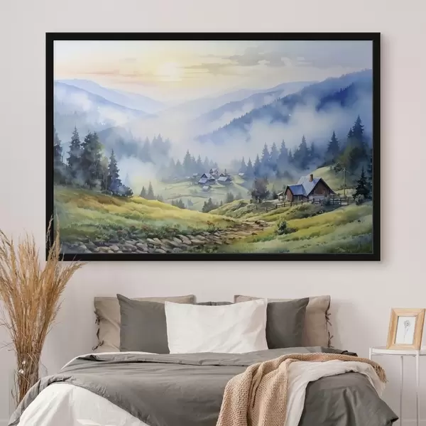 Poster Karpaten dorp in de mistige bergen, bos, aquarel Nr f41648