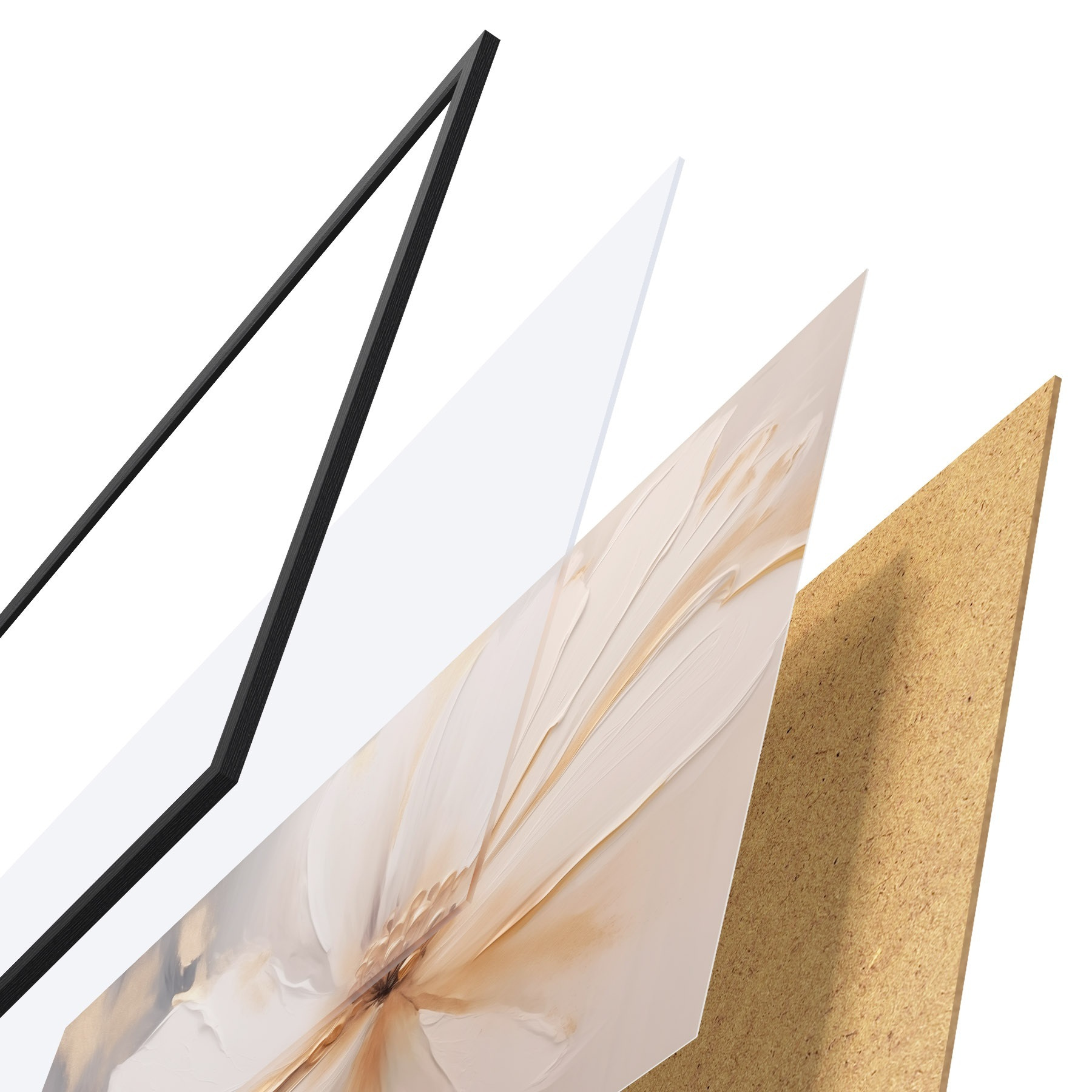 De poster bestaat uit een frame, plexiglas, geprinte afbeelding en spaanplaat achterkant. De poster kan meteen aan de muur worden gehangen dankzij de bevestigingen op de achterkant.