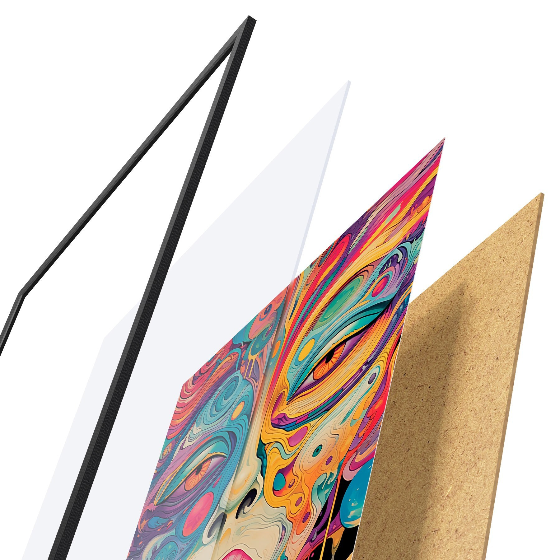 De poster bestaat uit een frame, plexiglas, geprinte afbeelding en spaanplaat achterkant. De poster kan meteen aan de muur worden gehangen dankzij de bevestigingen op de achterkant.