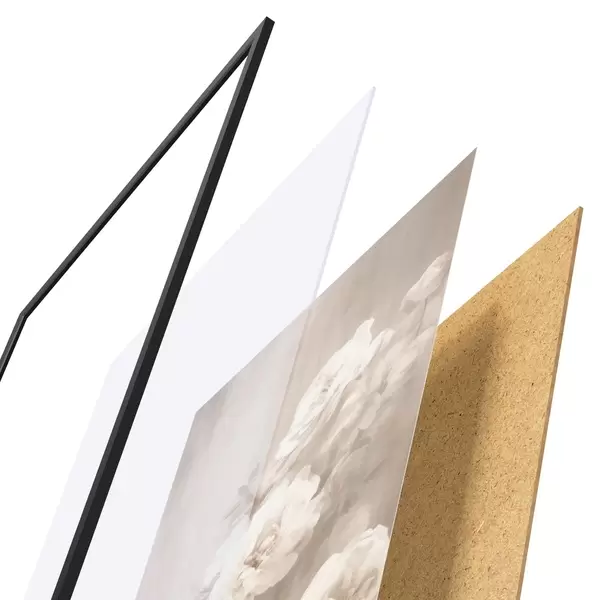 De poster bestaat uit een frame, plexiglas, geprinte afbeelding en spaanplaat achterkant. De poster kan meteen aan de muur worden gehangen dankzij de bevestigingen op de achterkant.