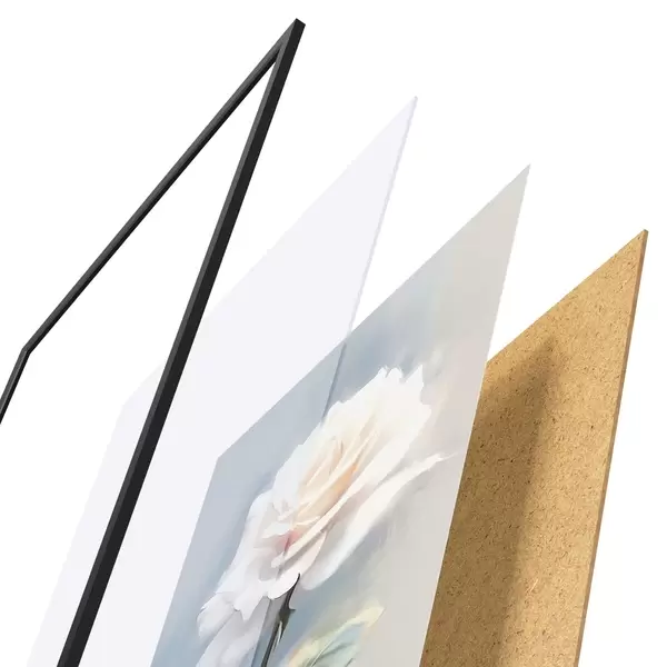 De poster bestaat uit een frame, plexiglas, geprinte afbeelding en spaanplaat achterkant. De poster kan meteen aan de muur worden gehangen dankzij de bevestigingen op de achterkant.