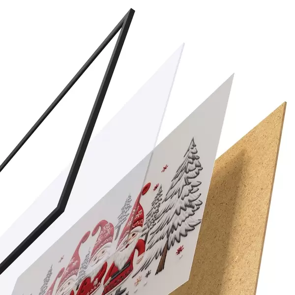 De poster bestaat uit een frame, plexiglas, geprinte afbeelding en spaanplaat achterkant. De poster kan meteen aan de muur worden gehangen dankzij de bevestigingen op de achterkant.