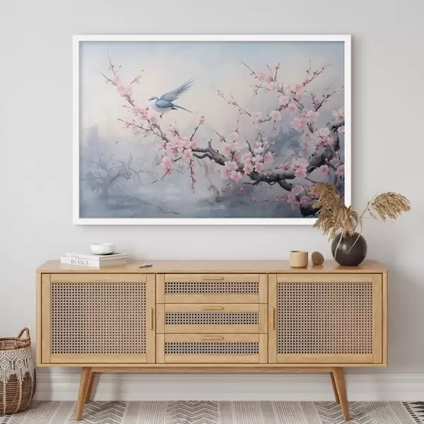 Poster Blauwe vogel vliegend tussen roze kersenbloesem bloemen op een mistige gedempte lente achtergrond Nr f41712