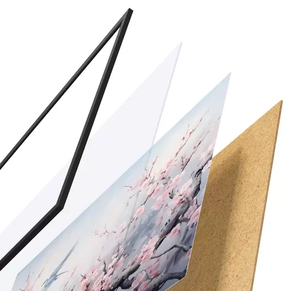 De poster bestaat uit een frame, plexiglas, geprinte afbeelding en spaanplaat achterkant. De poster kan meteen aan de muur worden gehangen dankzij de bevestigingen op de achterkant.