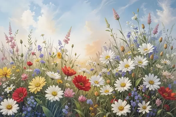 Poster Een veld met kleurrijke wilde bloemen zoals madeliefjes, klaprozen en andere bloeiende planten tegen een blauwe lucht Nr f41725