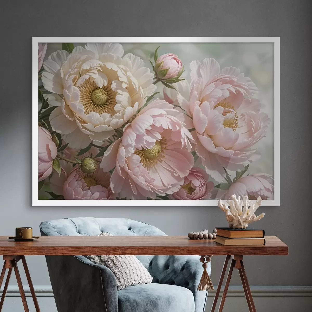 Poster Verschillende grote, weelderige pioenbloemen met delicate bloemblaadjes in roze en witte tinten Nr f41729