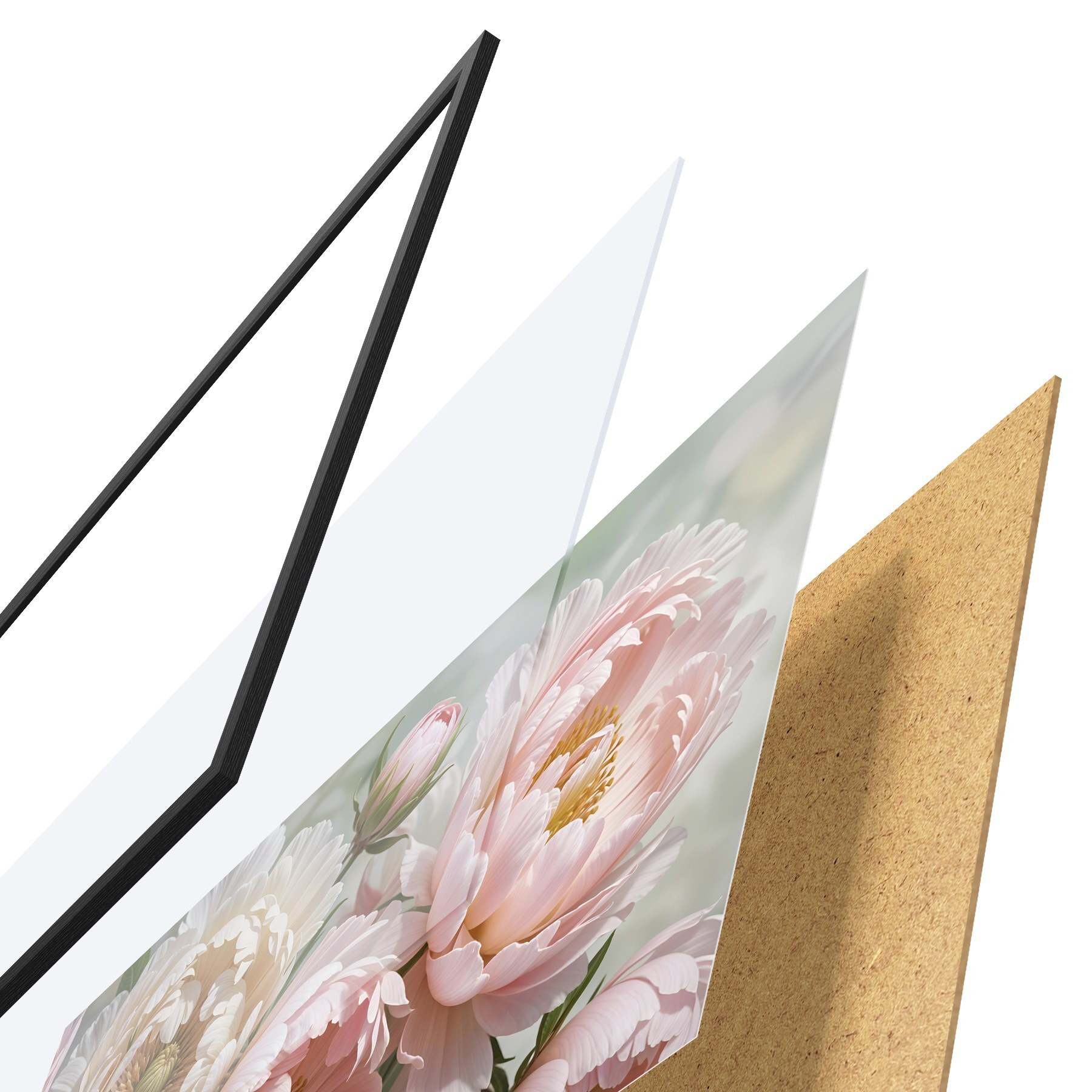 De poster bestaat uit een frame, plexiglas, geprinte afbeelding en spaanplaat achterkant. De poster kan meteen aan de muur worden gehangen dankzij de bevestigingen op de achterkant.