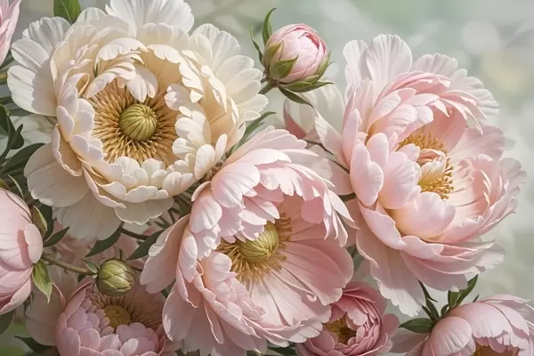 Poster Verschillende grote, weelderige pioenbloemen met delicate bloemblaadjes in roze en witte tinten Nr f41729