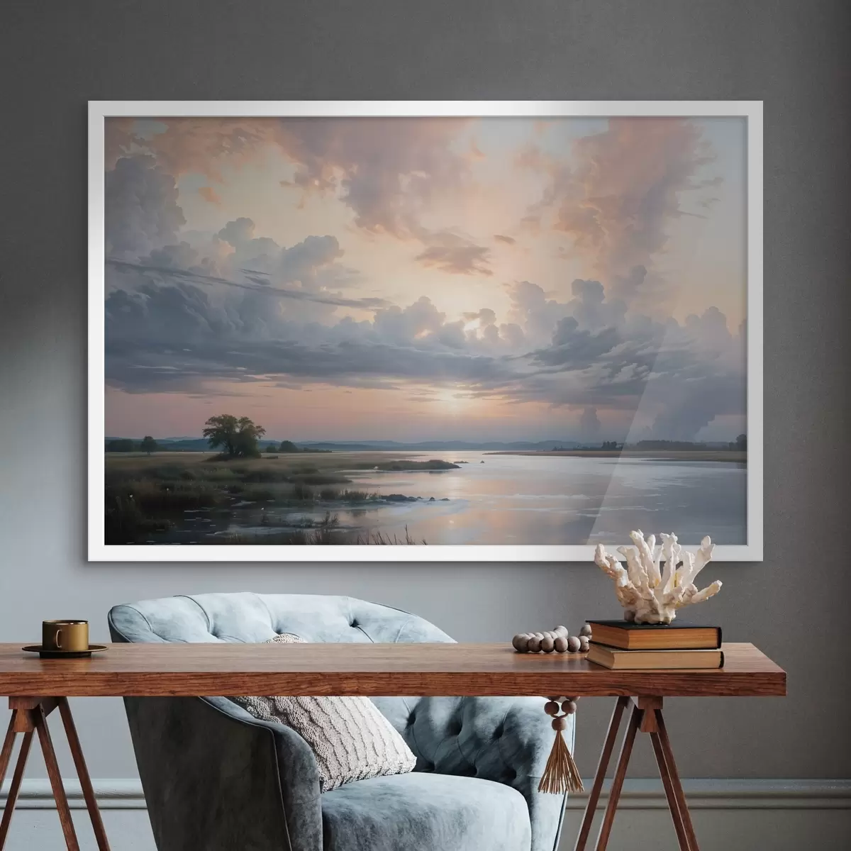 Poster Een sereen pastelkleurig landschap met een kalm meer dat de kleurrijke lucht weerspiegelt bij zonsondergang f41734