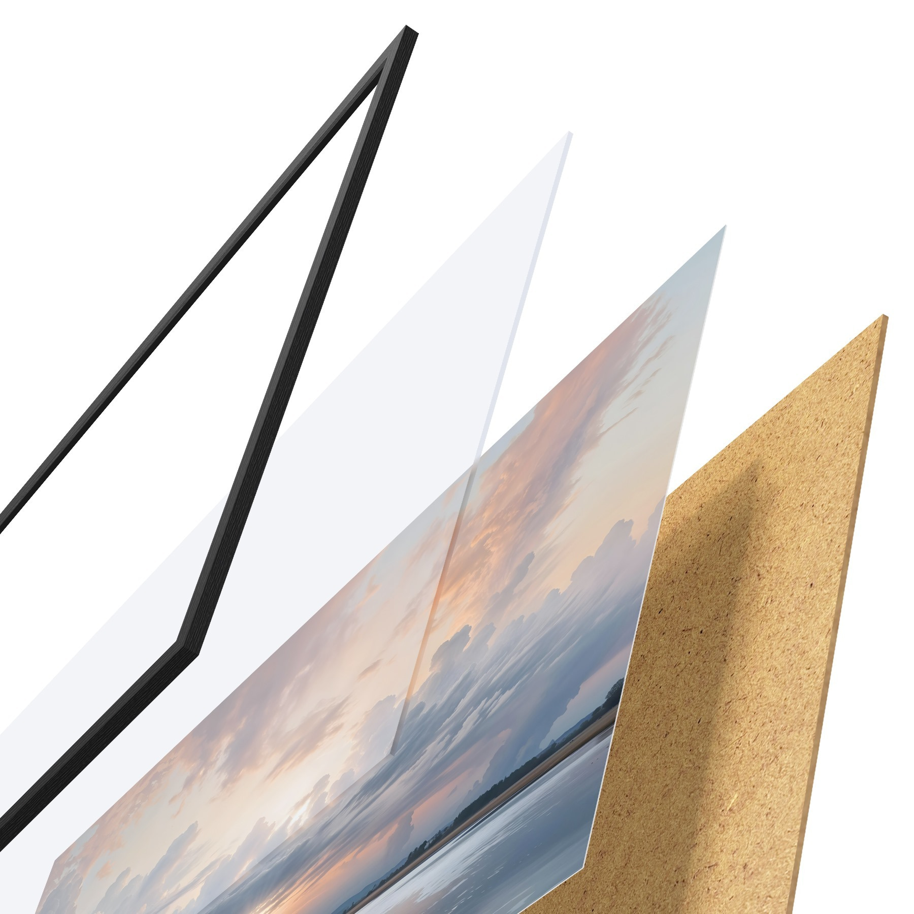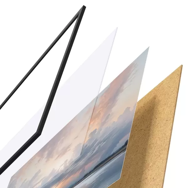 De poster bestaat uit een frame, plexiglas, geprinte afbeelding en spaanplaat achterkant. De poster kan meteen aan de muur worden gehangen dankzij de bevestigingen op de achterkant.