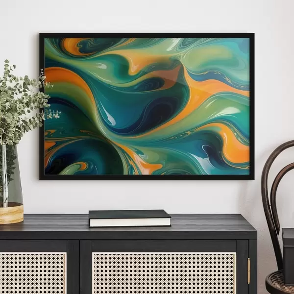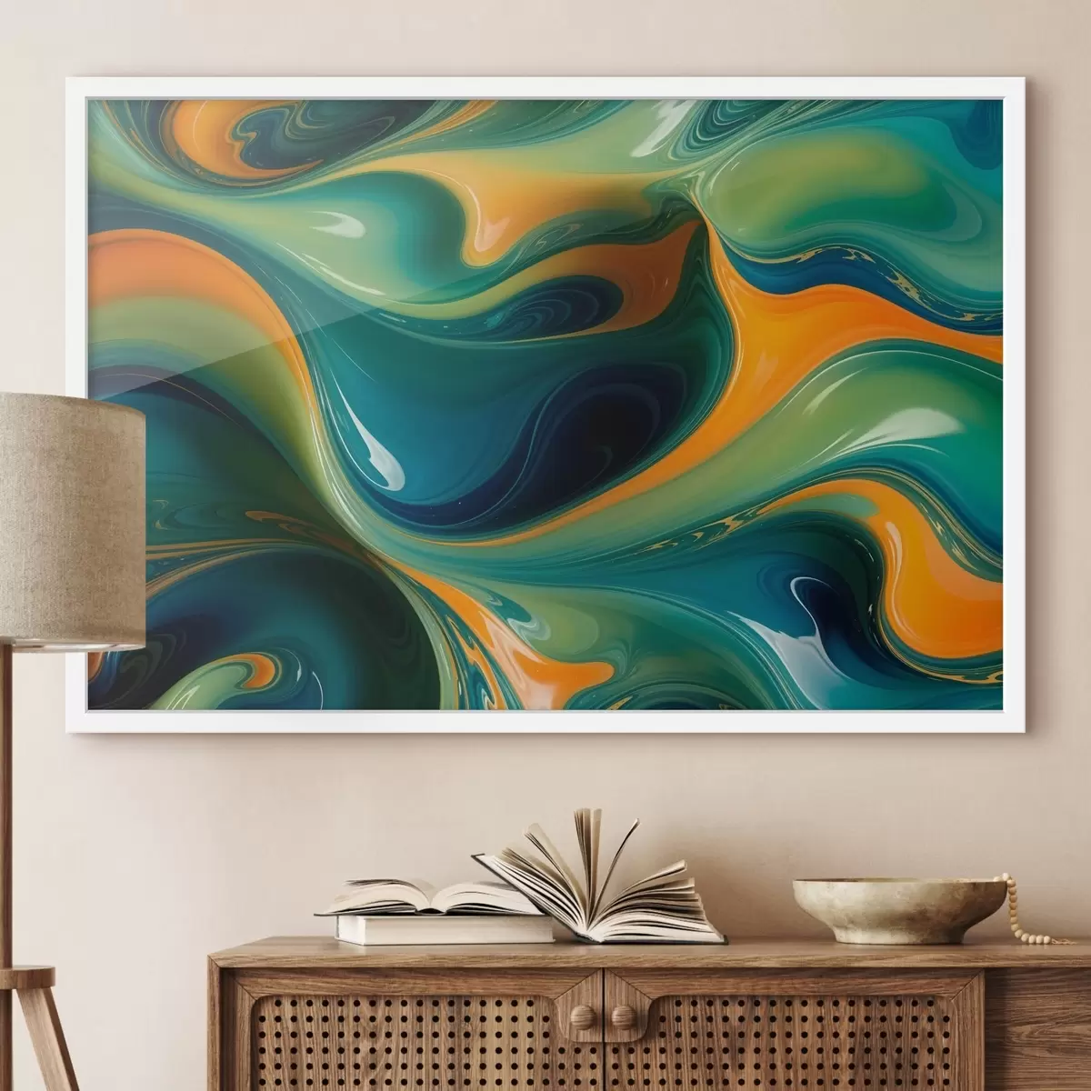 Poster Wervelende abstracte patronen in groene, blauwe en oranje tinten met vloeiende, organische vormen en texturen f41737