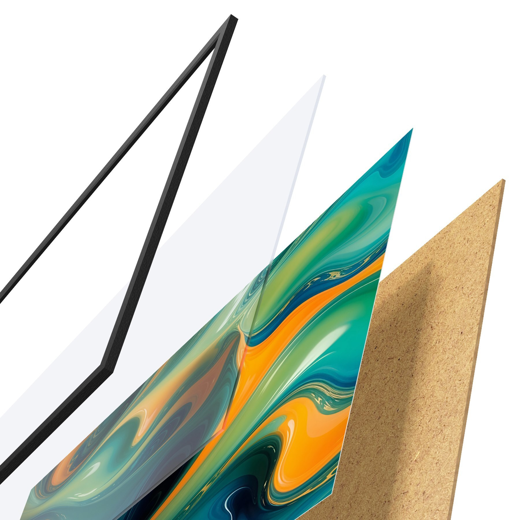 De poster bestaat uit een frame, plexiglas, geprinte afbeelding en spaanplaat achterkant. De poster kan meteen aan de muur worden gehangen dankzij de bevestigingen op de achterkant.