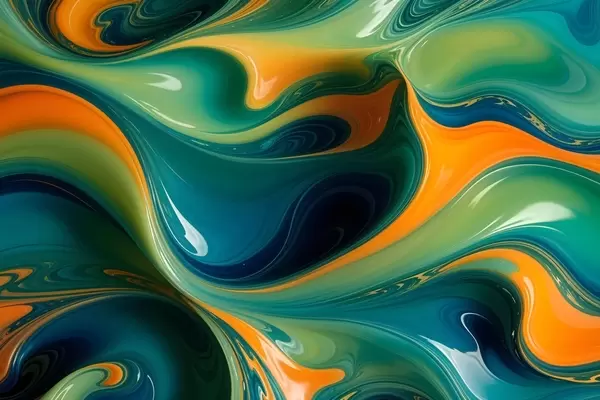 Poster Wervelende abstracte patronen in groene, blauwe en oranje tinten met vloeiende, organische vormen en texturen Nr f41737