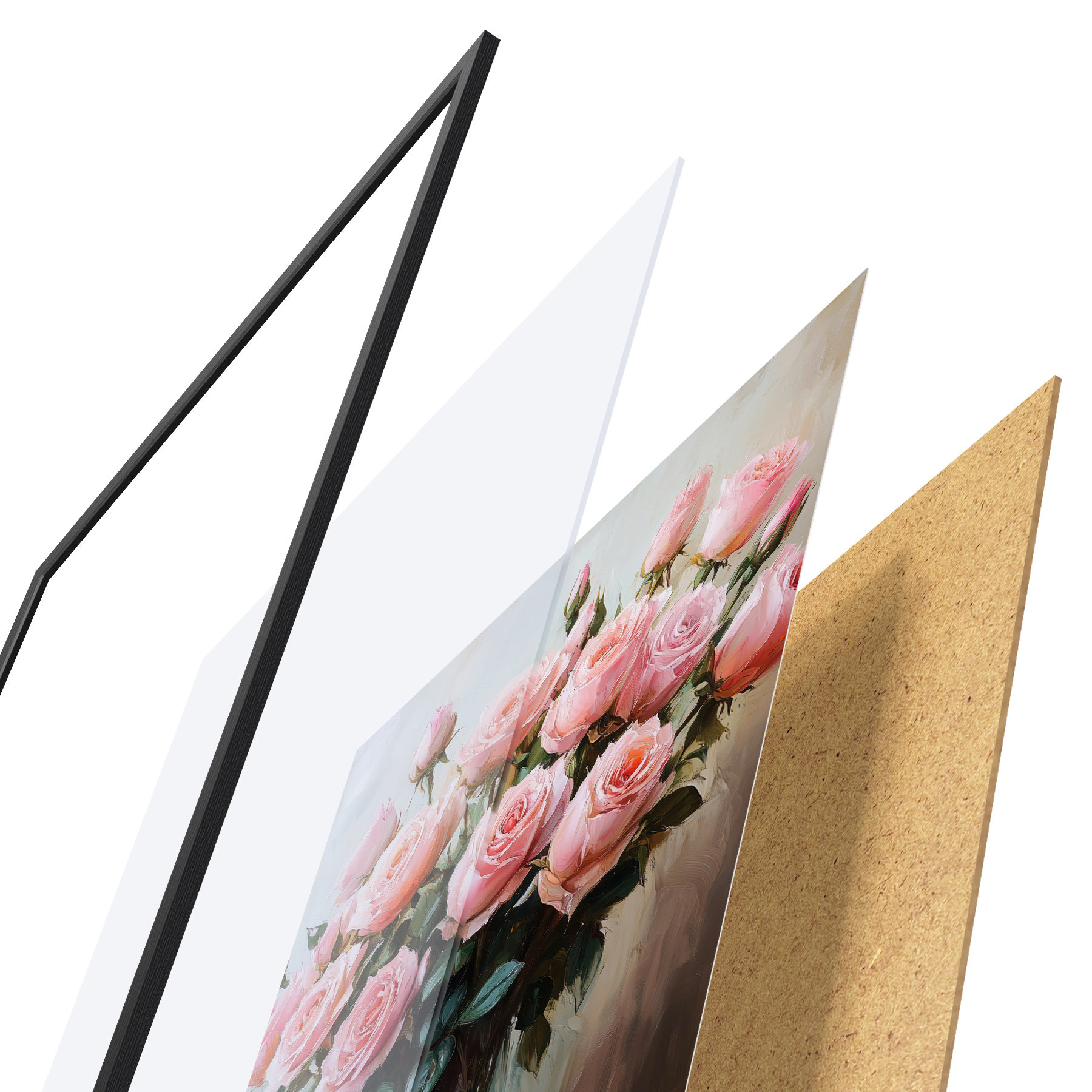 De poster bestaat uit een frame, plexiglas, geprinte afbeelding en spaanplaat achterkant. De poster kan meteen aan de muur worden gehangen dankzij de bevestigingen op de achterkant.
