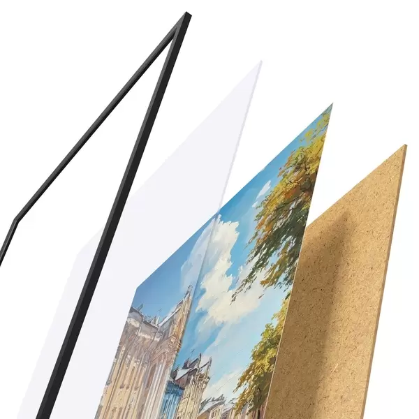 De poster bestaat uit een frame, plexiglas, geprinte afbeelding en spaanplaat achterkant. De poster kan meteen aan de muur worden gehangen dankzij de bevestigingen op de achterkant.