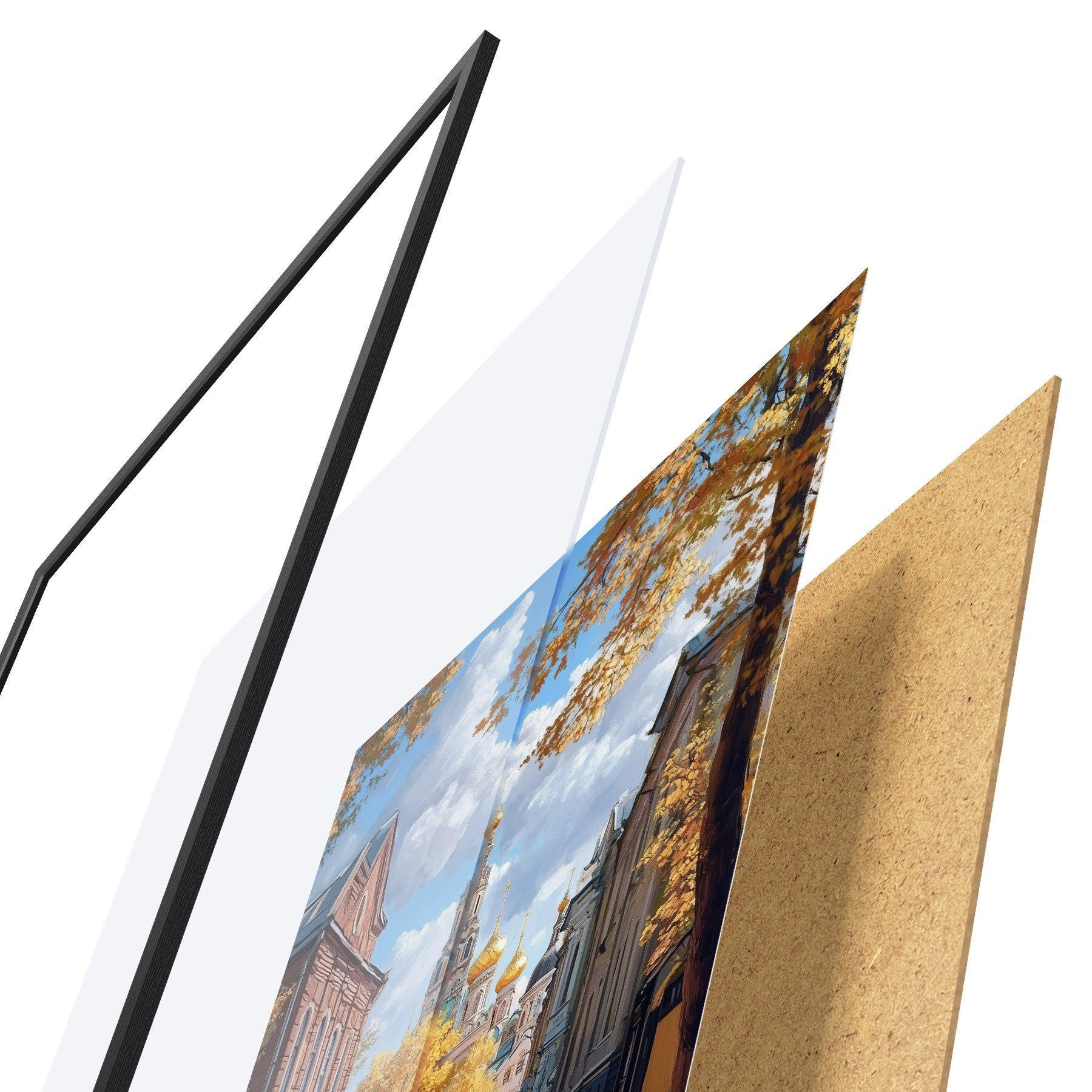 De poster bestaat uit een frame, plexiglas, geprinte afbeelding en spaanplaat achterkant. De poster kan meteen aan de muur worden gehangen dankzij de bevestigingen op de achterkant.