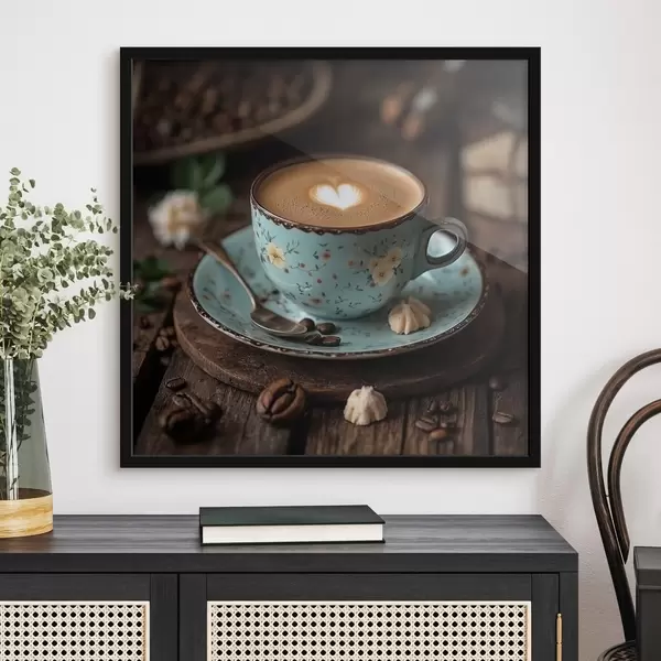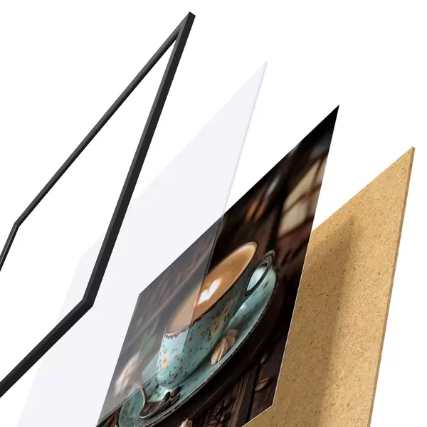 De poster bestaat uit een frame, plexiglas, geprinte afbeelding en spaanplaat achterkant. De poster kan meteen aan de muur worden gehangen dankzij de bevestigingen op de achterkant.
