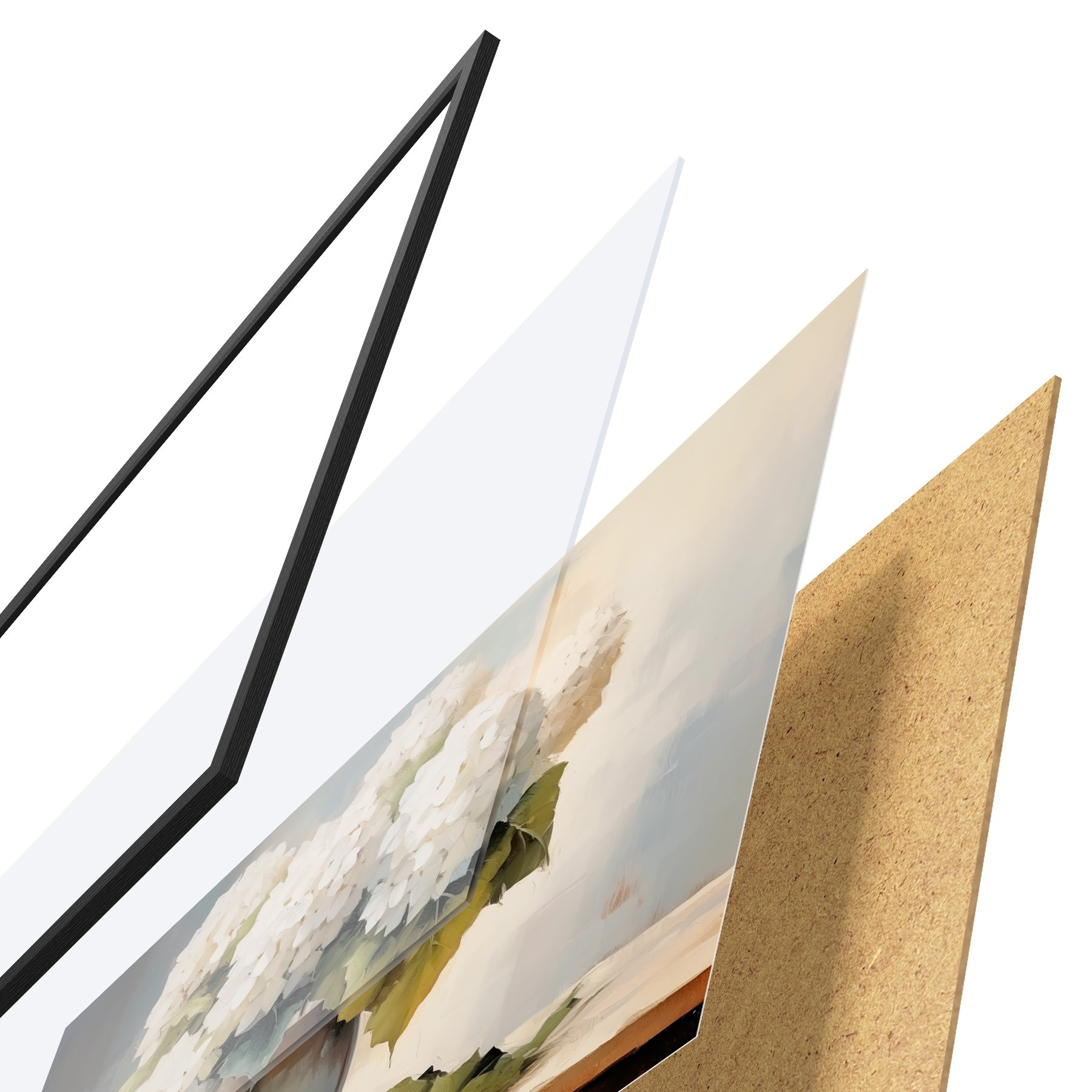 De poster bestaat uit een frame, plexiglas, geprinte afbeelding en spaanplaat achterkant. De poster kan meteen aan de muur worden gehangen dankzij de bevestigingen op de achterkant.