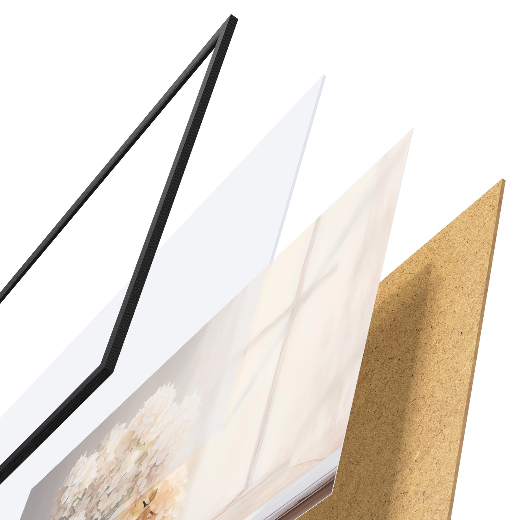 De poster bestaat uit een frame, plexiglas, geprinte afbeelding en spaanplaat achterkant. De poster kan meteen aan de muur worden gehangen dankzij de bevestigingen op de achterkant.