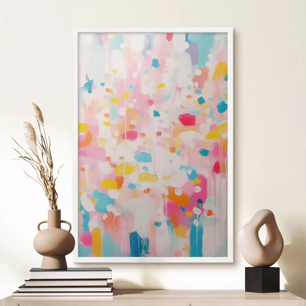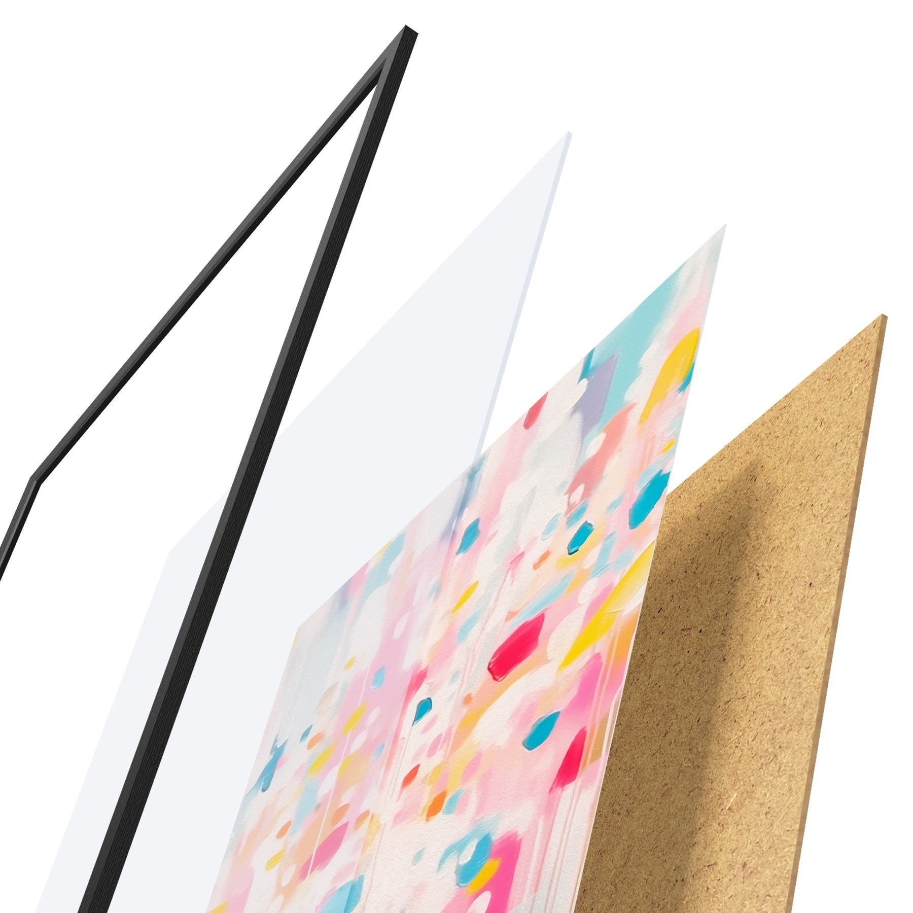 De poster bestaat uit een frame, plexiglas, geprinte afbeelding en spaanplaat achterkant. De poster kan meteen aan de muur worden gehangen dankzij de bevestigingen op de achterkant.