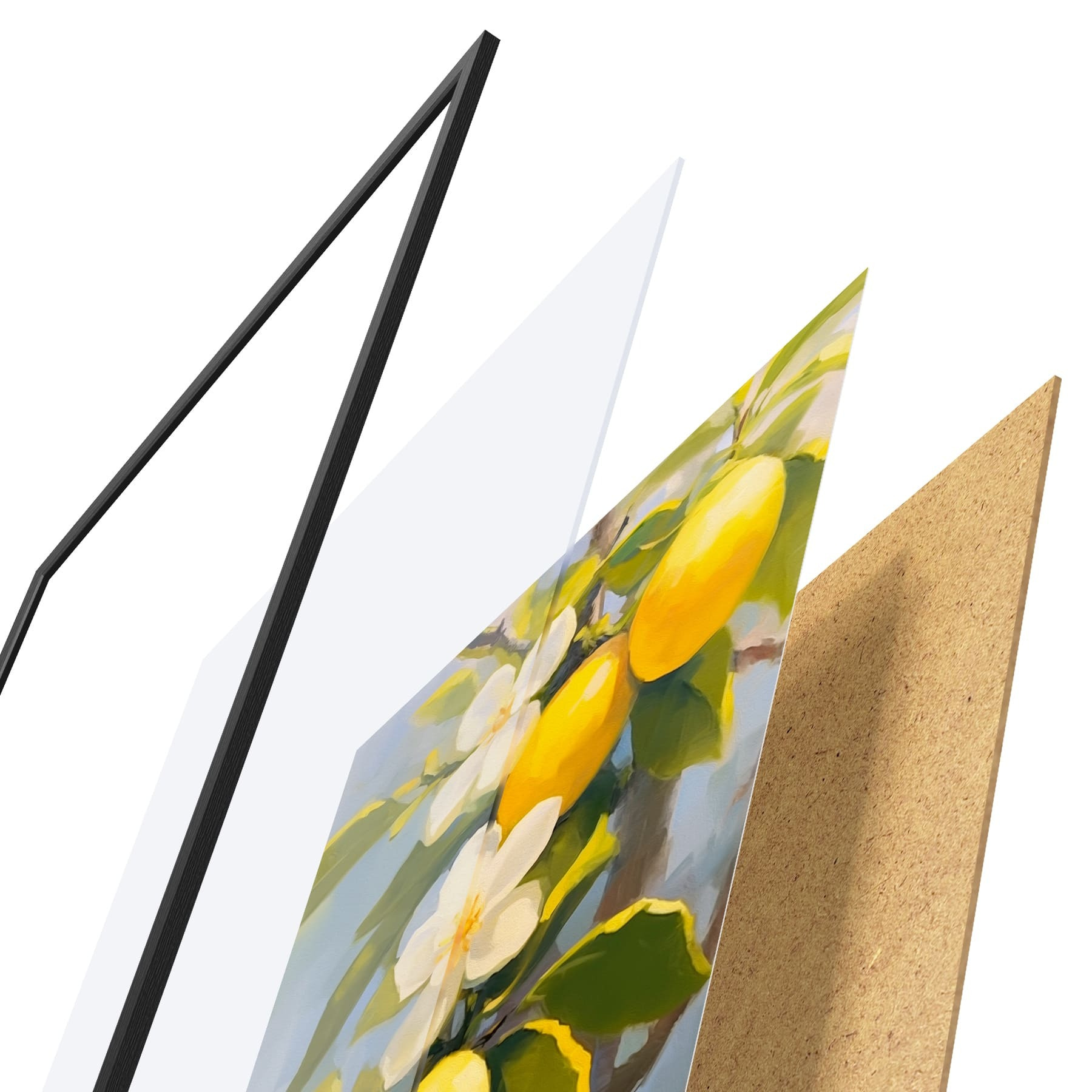De poster bestaat uit een frame, plexiglas, geprinte afbeelding en spaanplaat achterkant. De poster kan meteen aan de muur worden gehangen dankzij de bevestigingen op de achterkant.