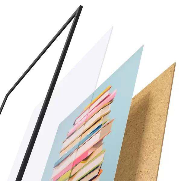 De poster bestaat uit een frame, plexiglas, geprinte afbeelding en spaanplaat achterkant. De poster kan meteen aan de muur worden gehangen dankzij de bevestigingen op de achterkant.