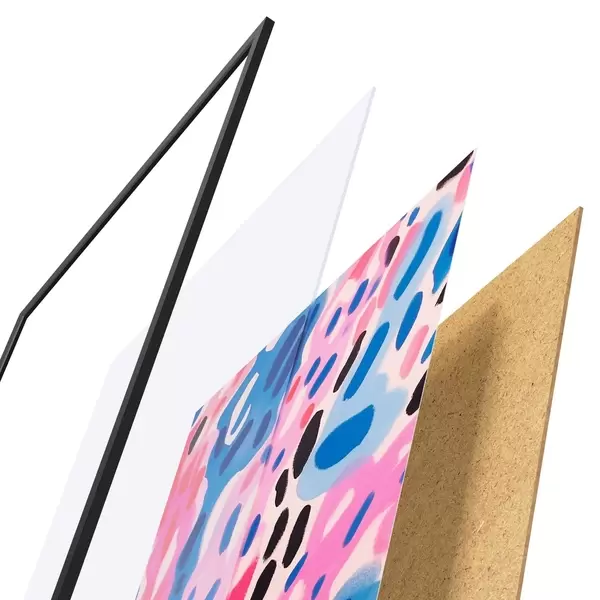 De poster bestaat uit een frame, plexiglas, geprinte afbeelding en spaanplaat achterkant. De poster kan meteen aan de muur worden gehangen dankzij de bevestigingen op de achterkant.