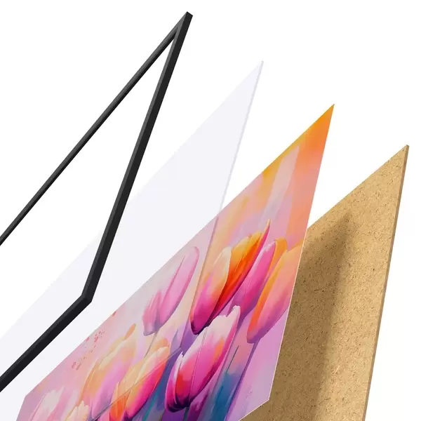 De poster bestaat uit een frame, plexiglas, geprinte afbeelding en spaanplaat achterkant. De poster kan meteen aan de muur worden gehangen dankzij de bevestigingen op de achterkant.