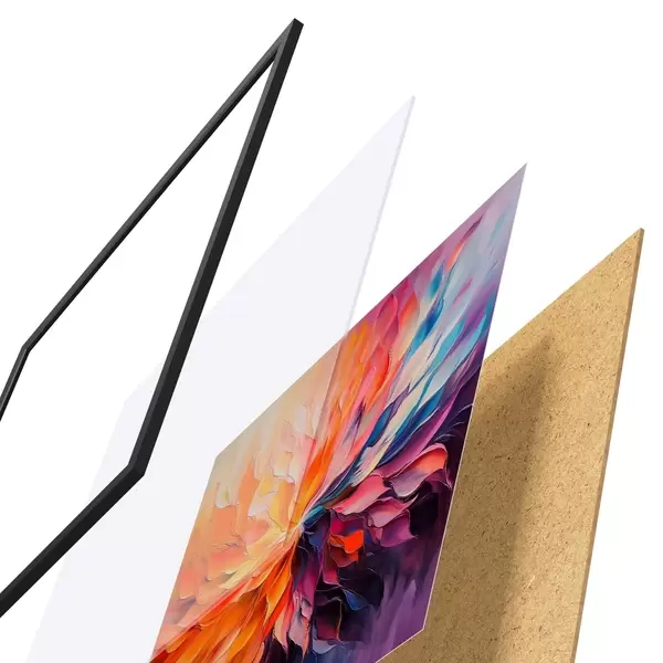 De poster bestaat uit een frame, plexiglas, geprinte afbeelding en spaanplaat achterkant. De poster kan meteen aan de muur worden gehangen dankzij de bevestigingen op de achterkant.