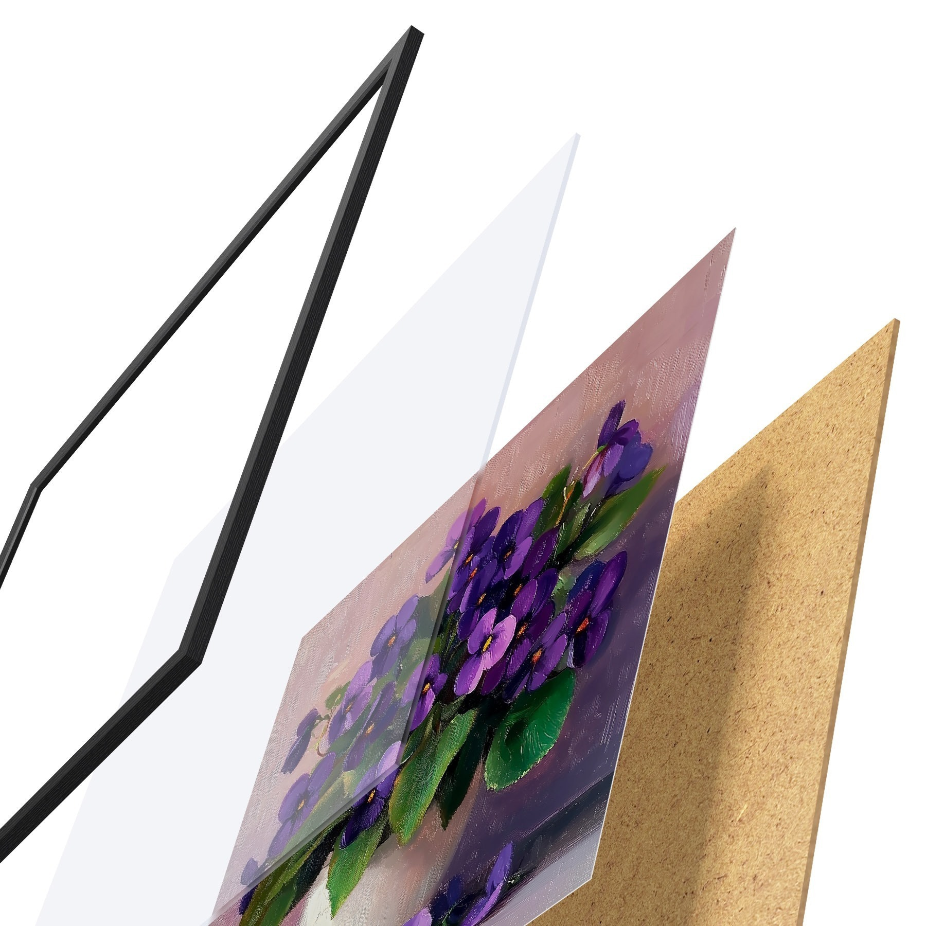 De poster bestaat uit een frame, plexiglas, geprinte afbeelding en spaanplaat achterkant. De poster kan meteen aan de muur worden gehangen dankzij de bevestigingen op de achterkant.