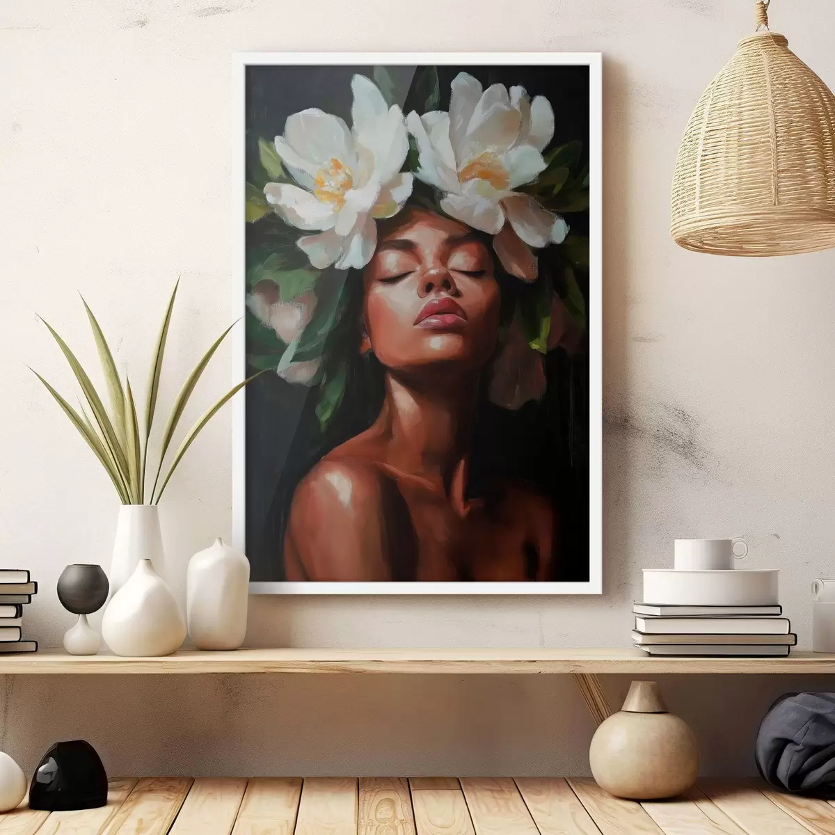 Poster Een vrouwenportret met witte bloemen in haar haar op een donkere achtergrond f41824