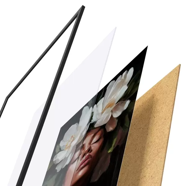 De poster bestaat uit een frame, plexiglas, geprinte afbeelding en spaanplaat achterkant. De poster kan meteen aan de muur worden gehangen dankzij de bevestigingen op de achterkant.