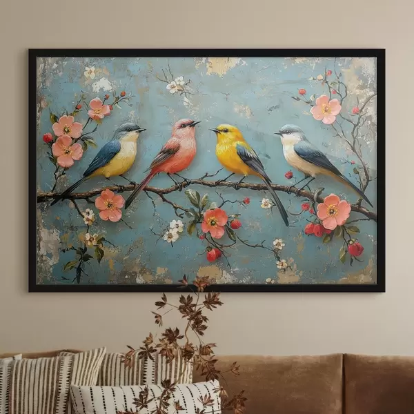 Poster Vogels op een tak van sakura in de stijl van olieverfschilderij Nr f41834