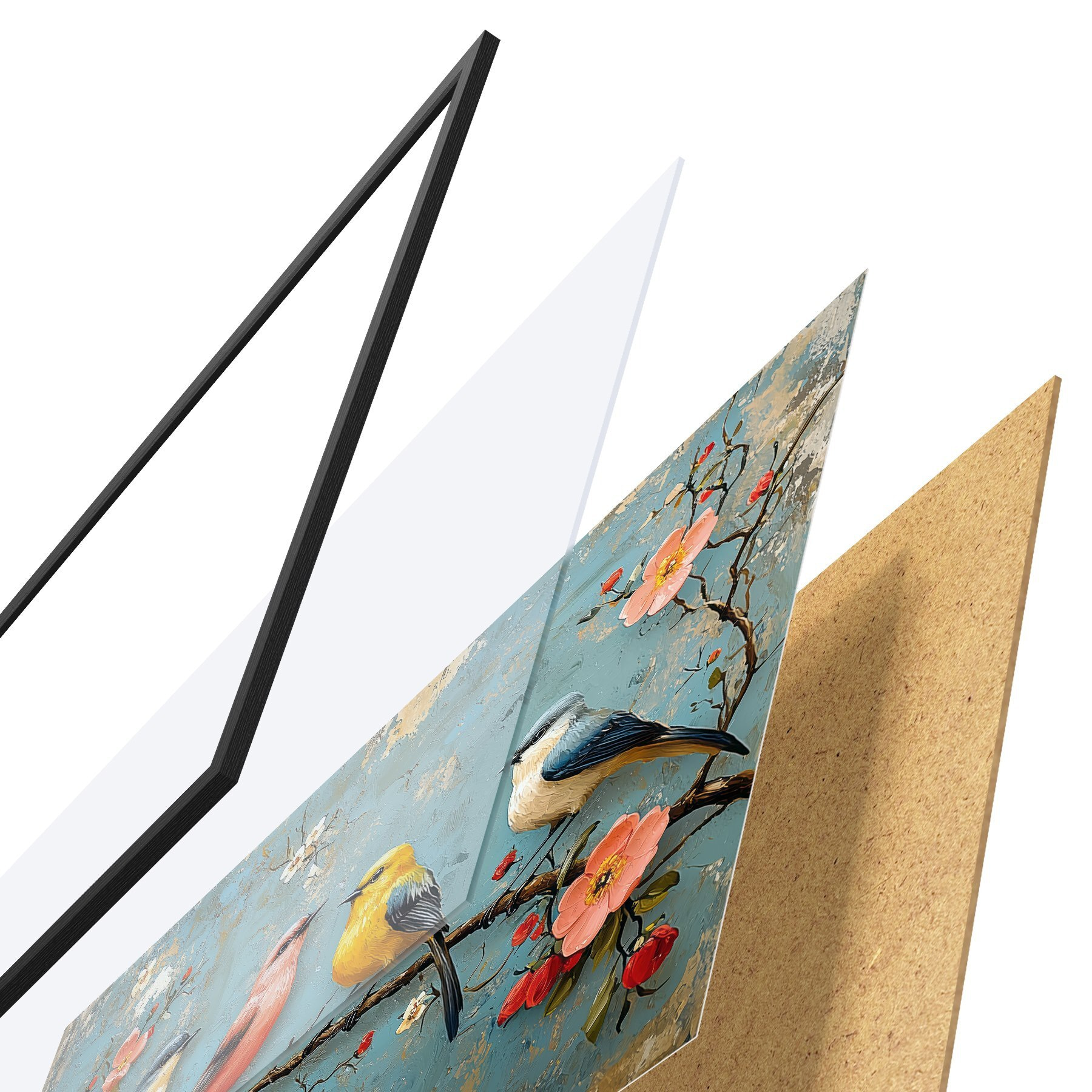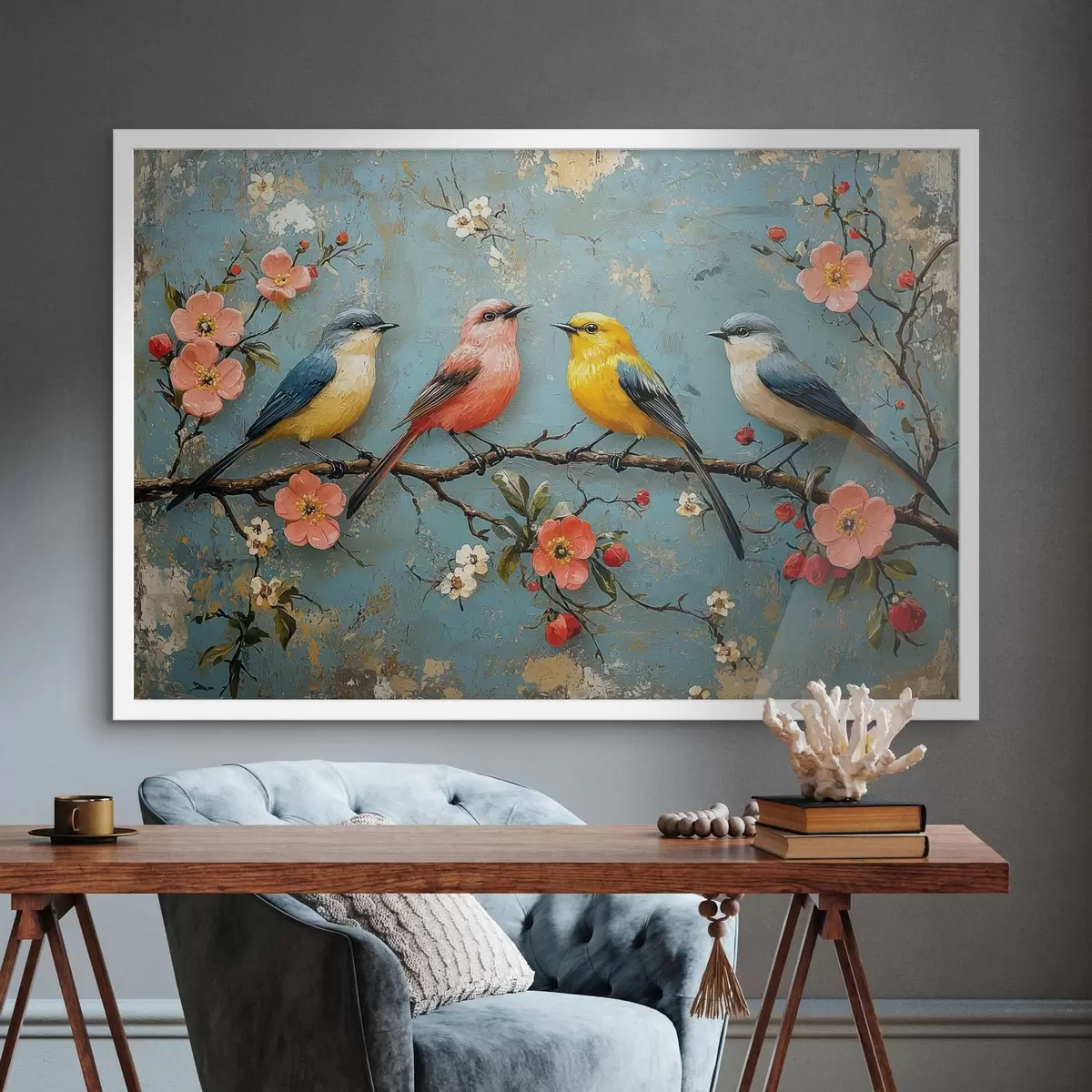 Poster Vogels op een tak van sakura in de stijl van olieverfschilderij f41834