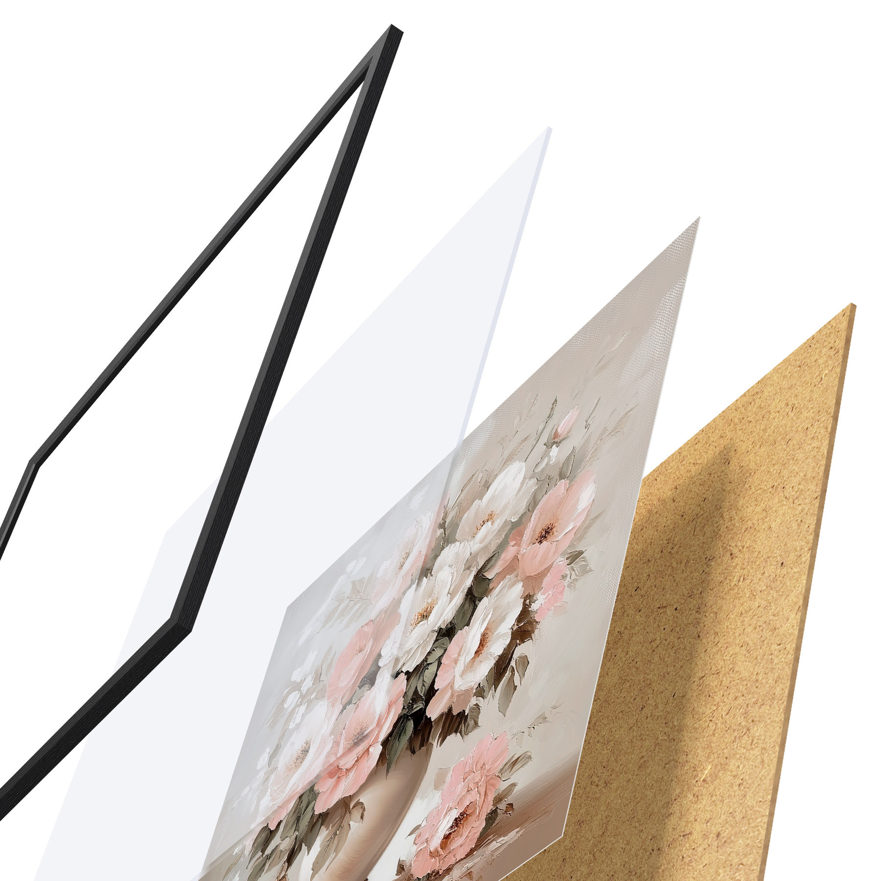De poster bestaat uit een frame, plexiglas, geprinte afbeelding en spaanplaat achterkant. De poster kan meteen aan de muur worden gehangen dankzij de bevestigingen op de achterkant.