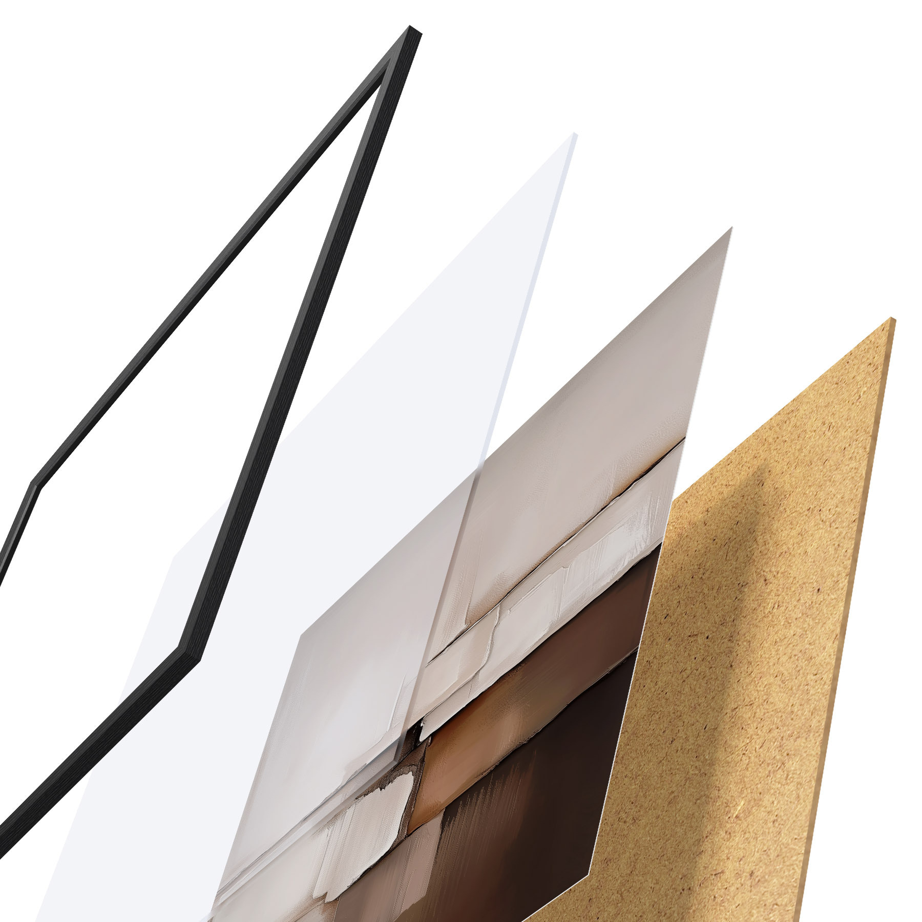De poster bestaat uit een frame, plexiglas, geprinte afbeelding en spaanplaat achterkant. De poster kan meteen aan de muur worden gehangen dankzij de bevestigingen op de achterkant.