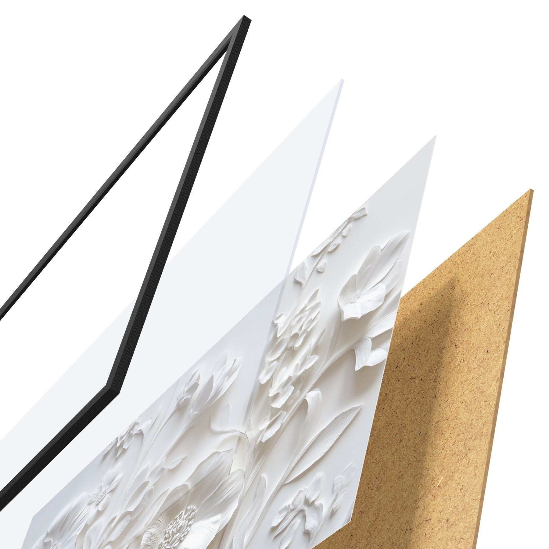 De poster bestaat uit een frame, plexiglas, geprinte afbeelding en spaanplaat achterkant. De poster kan meteen aan de muur worden gehangen dankzij de bevestigingen op de achterkant.
