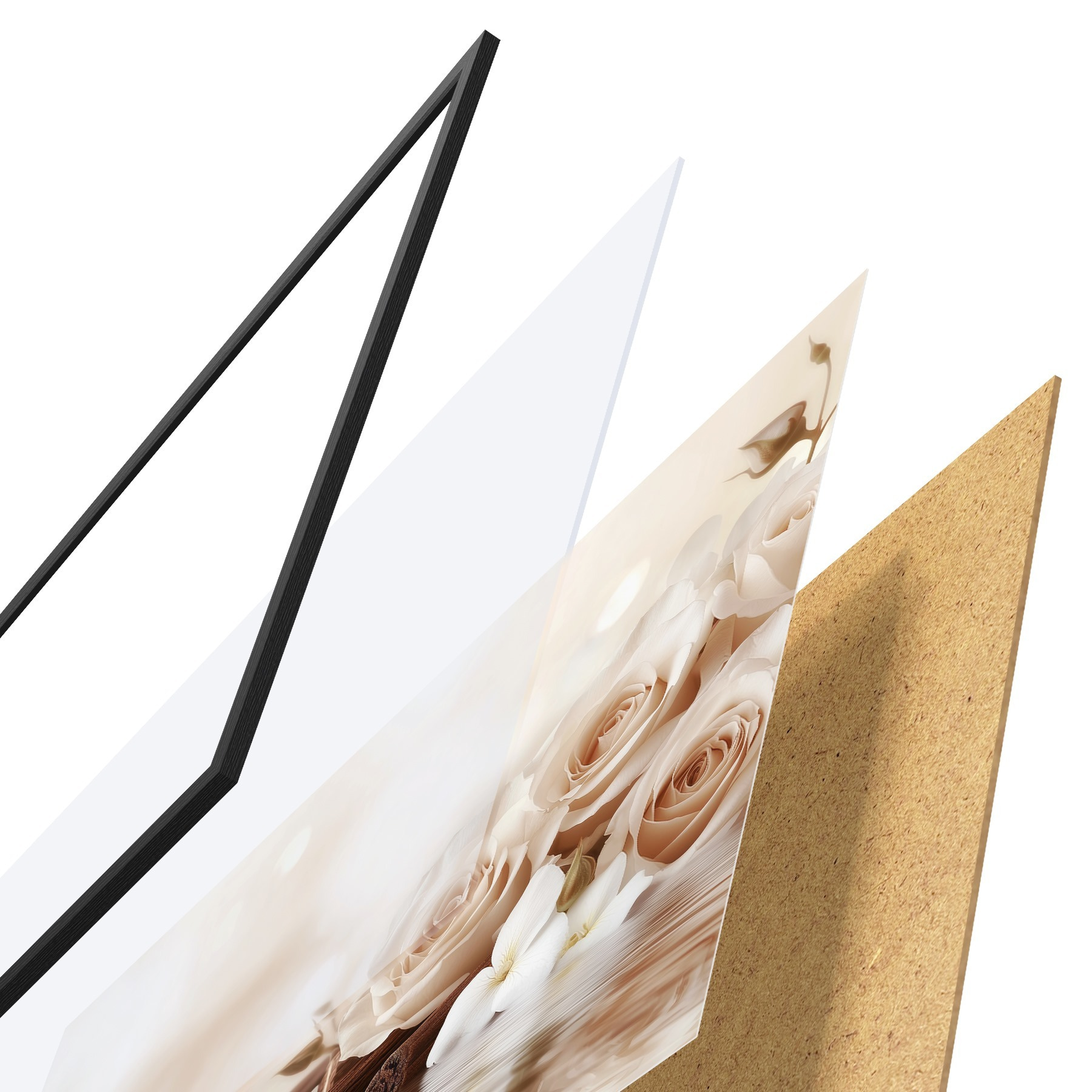 De poster bestaat uit een frame, plexiglas, geprinte afbeelding en spaanplaat achterkant. De poster kan meteen aan de muur worden gehangen dankzij de bevestigingen op de achterkant.