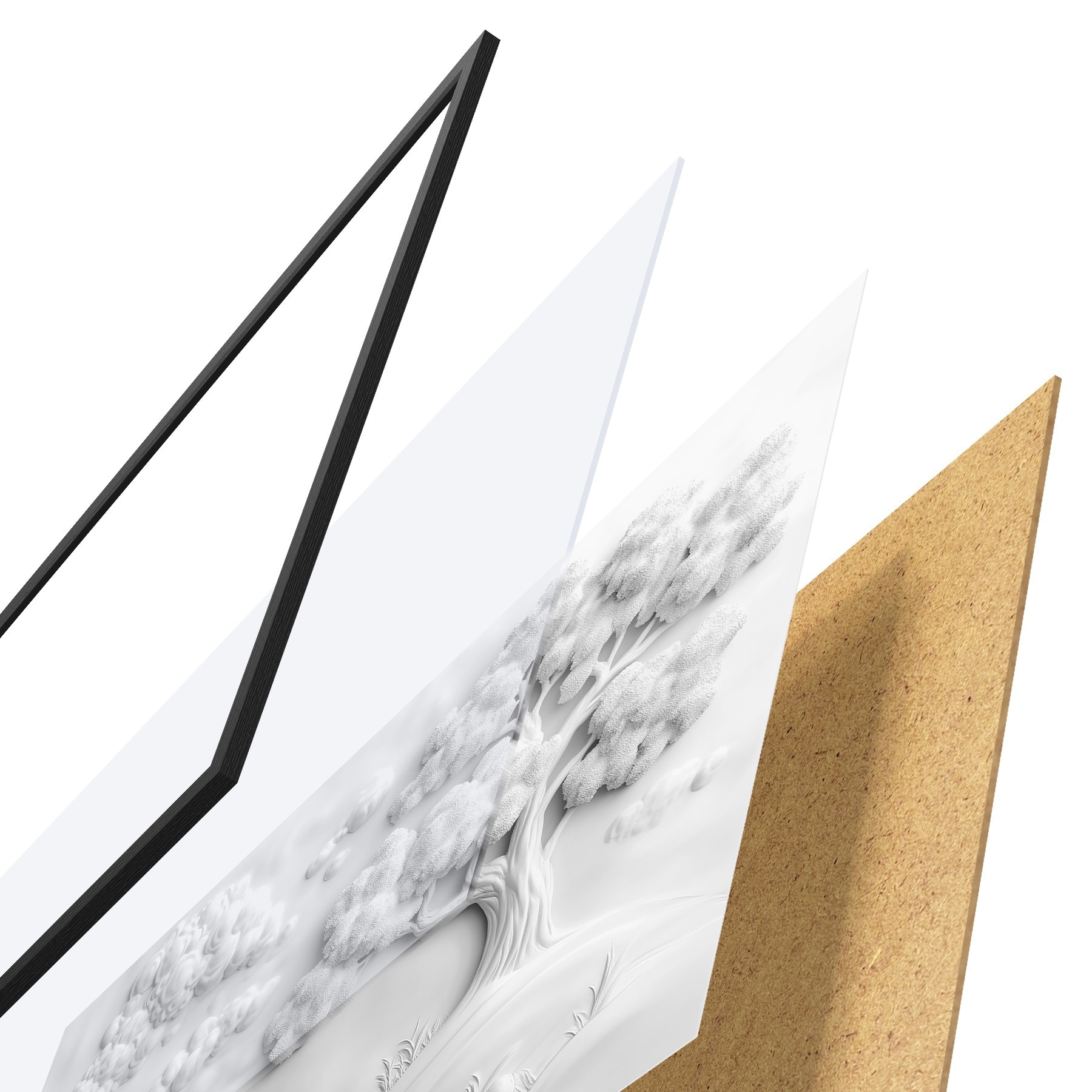 De poster bestaat uit een frame, plexiglas, geprinte afbeelding en spaanplaat achterkant. De poster kan meteen aan de muur worden gehangen dankzij de bevestigingen op de achterkant.