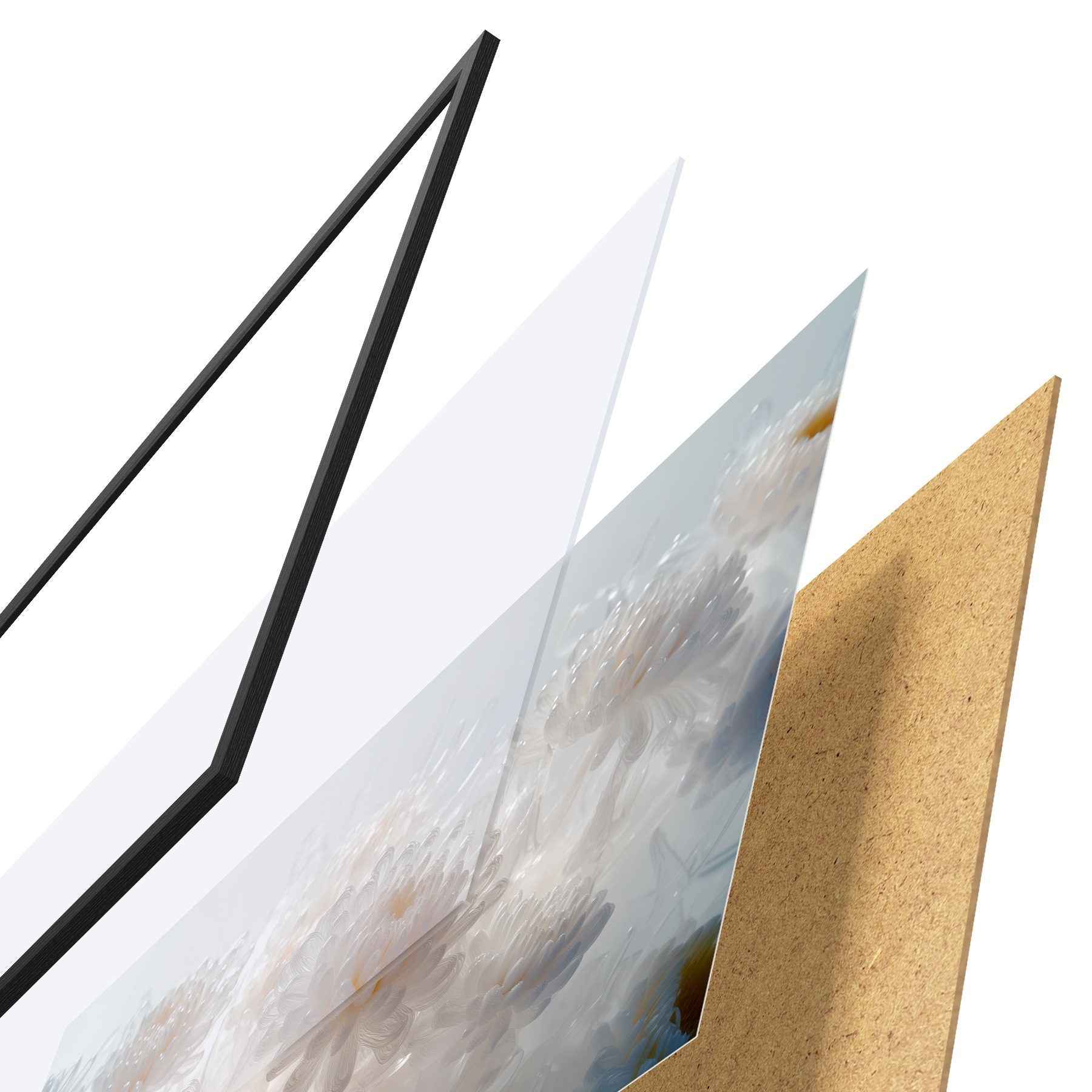 De poster bestaat uit een frame, plexiglas, geprinte afbeelding en spaanplaat achterkant. De poster kan meteen aan de muur worden gehangen dankzij de bevestigingen op de achterkant.