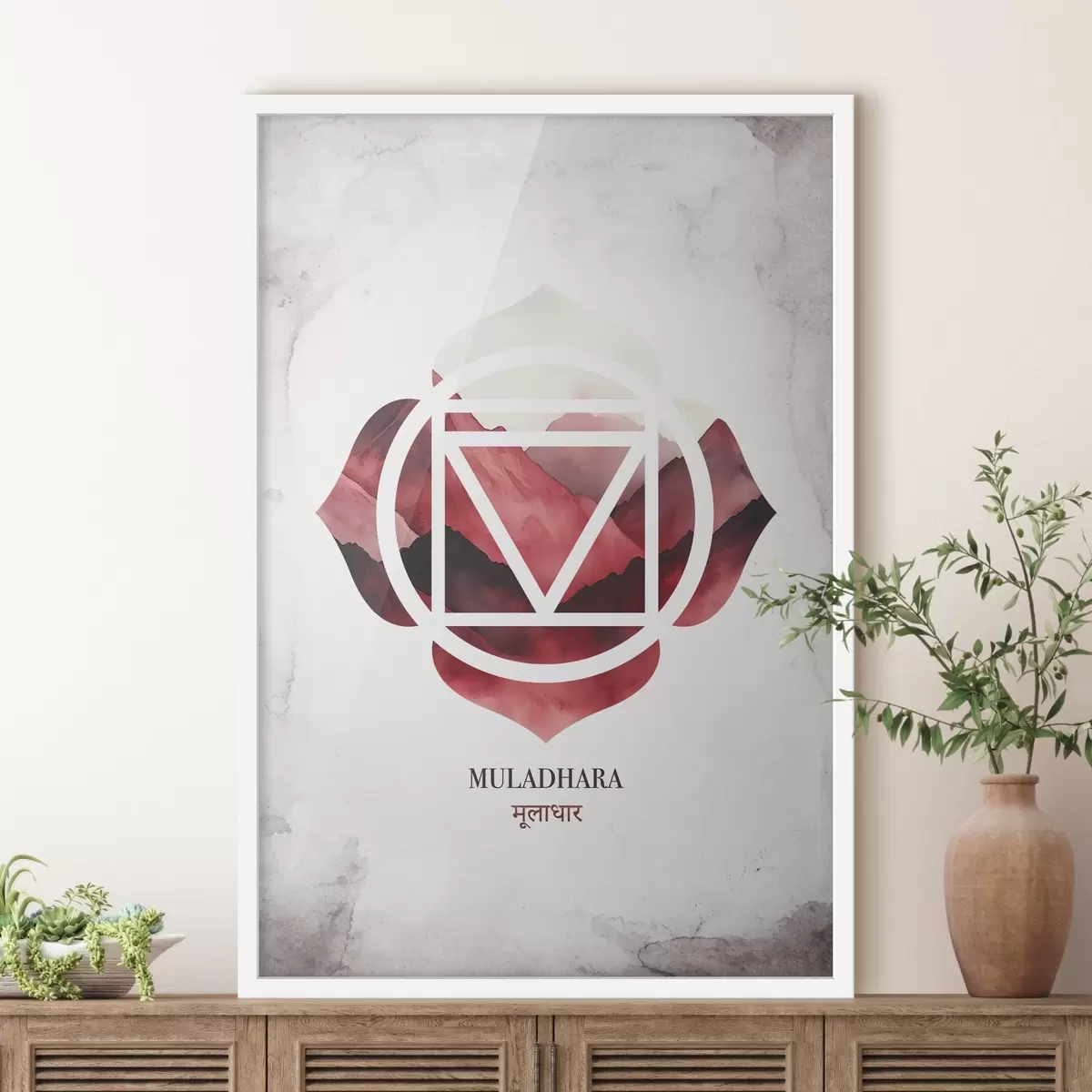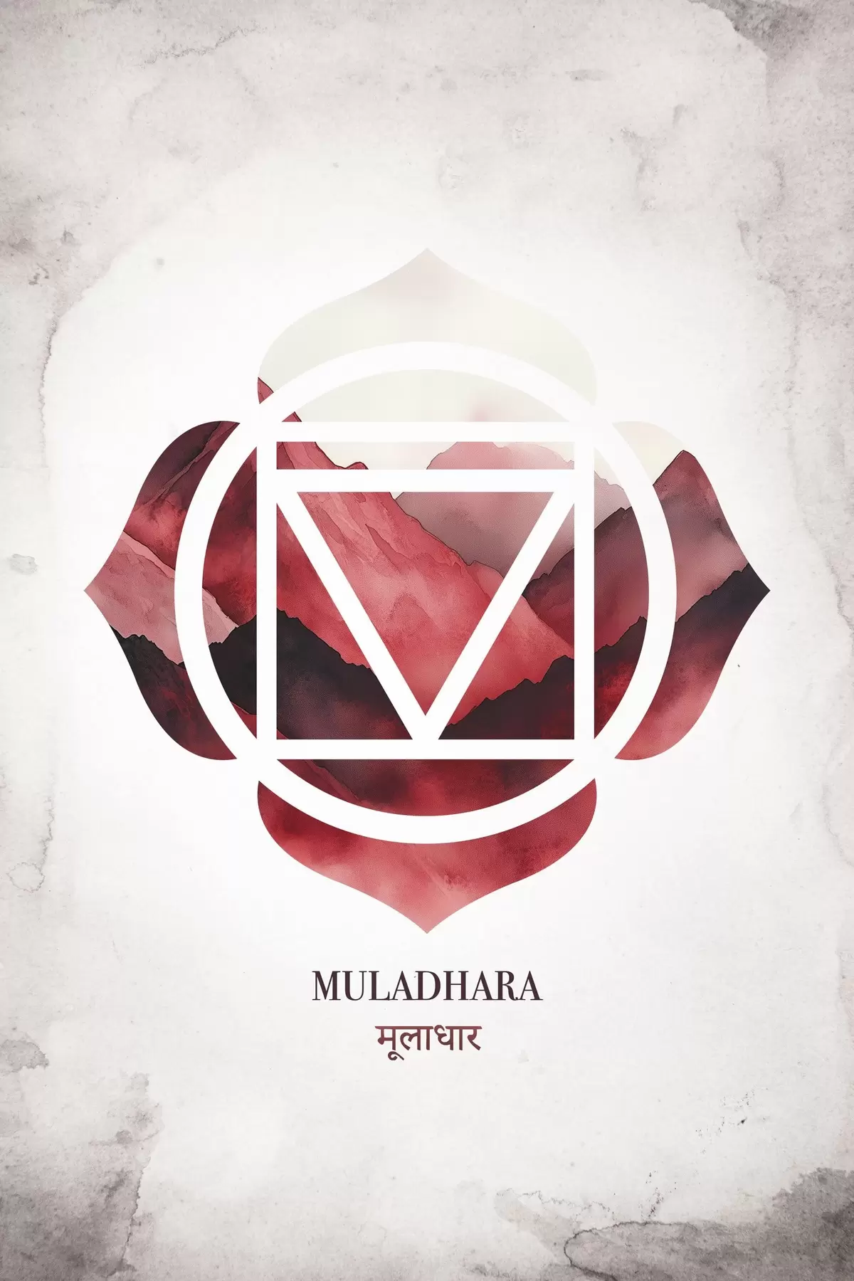 Poster Muladhara chakra, rood chakra, esoterisch, meditatie, boeddhisme, aquarel stijl bergen f41880