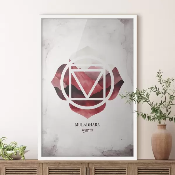Poster Muladhara chakra, rood chakra, esoterisch, meditatie, boeddhisme, aquarel stijl bergen Nr f41880