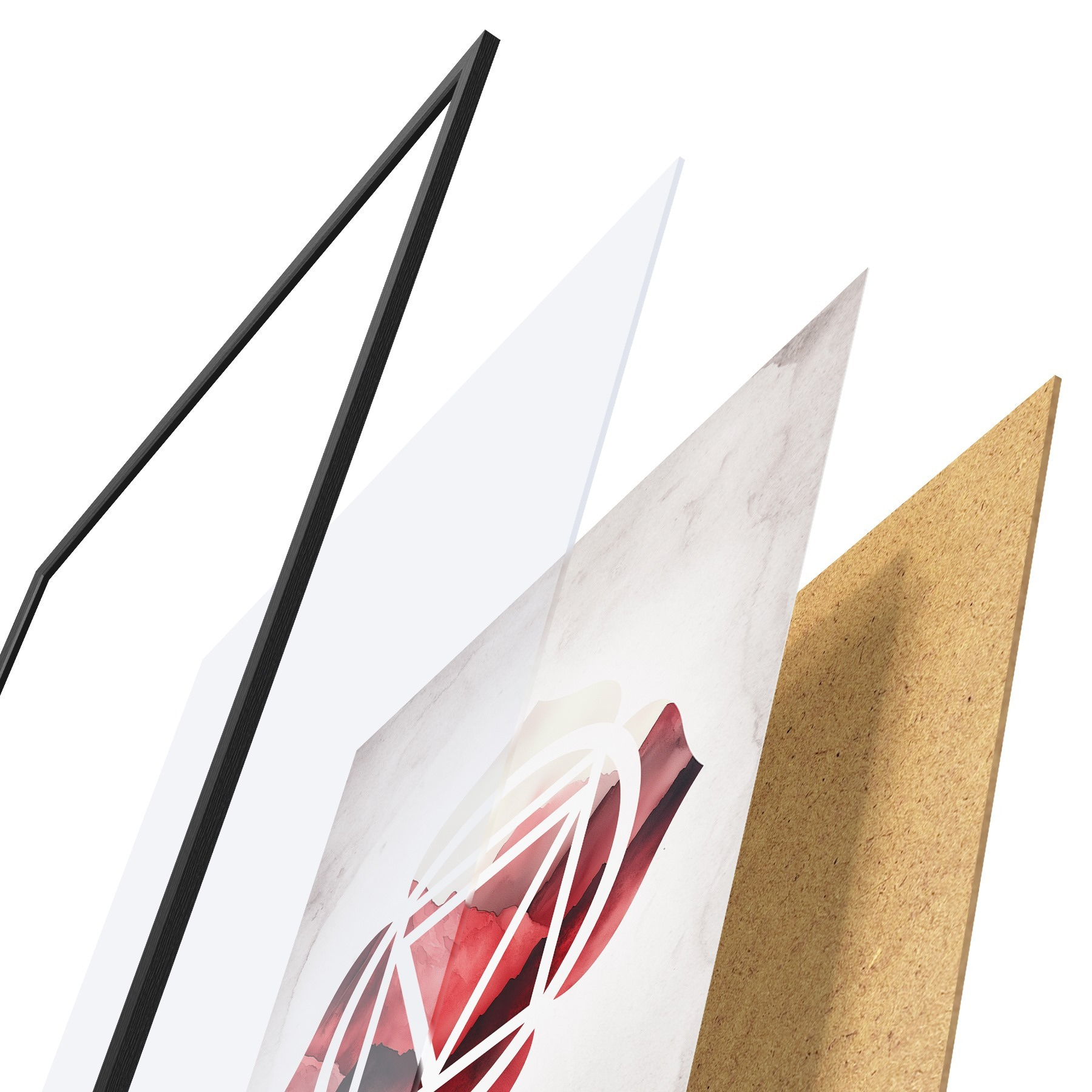 De poster bestaat uit een frame, plexiglas, geprinte afbeelding en spaanplaat achterkant. De poster kan meteen aan de muur worden gehangen dankzij de bevestigingen op de achterkant.
