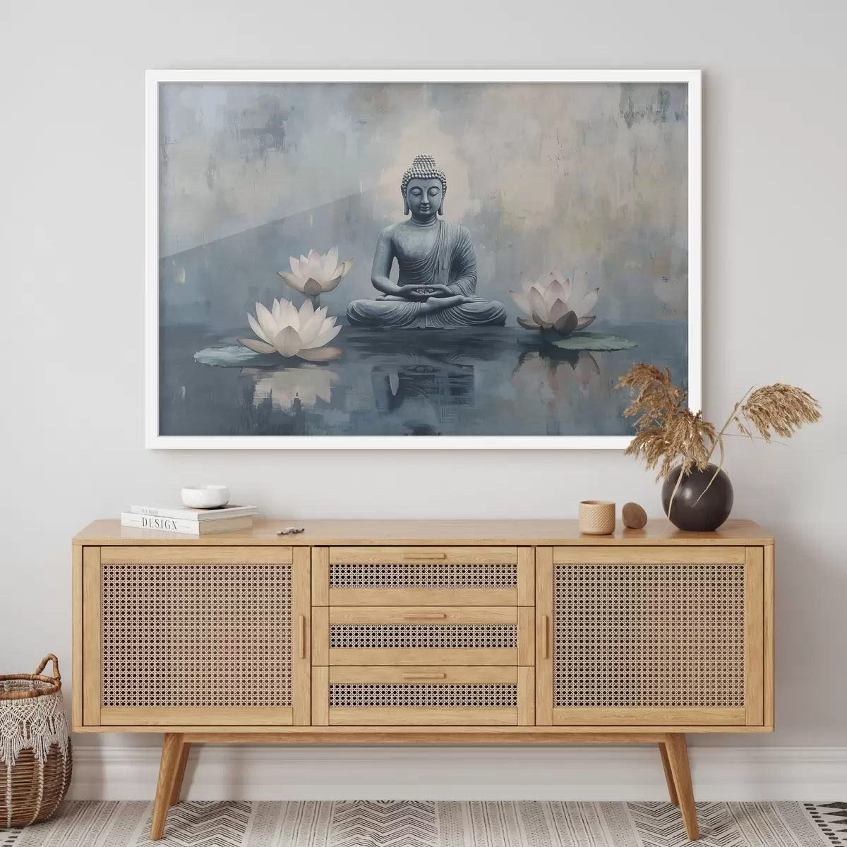 Poster Mediterende Boeddha in het meer met lotussen, oosters, acrylstijl Nr f41891