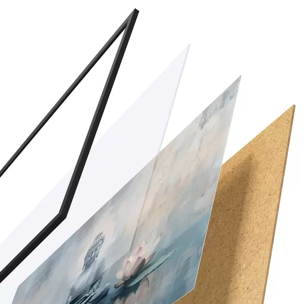De poster bestaat uit een frame, plexiglas, geprinte afbeelding en spaanplaat achterkant. De poster kan meteen aan de muur worden gehangen dankzij de bevestigingen op de achterkant.