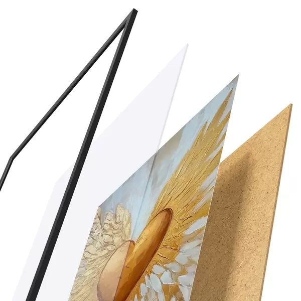 De poster bestaat uit een frame, plexiglas, geprinte afbeelding en spaanplaat achterkant. De poster kan meteen aan de muur worden gehangen dankzij de bevestigingen op de achterkant.