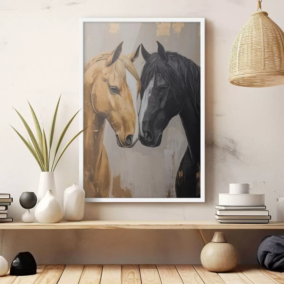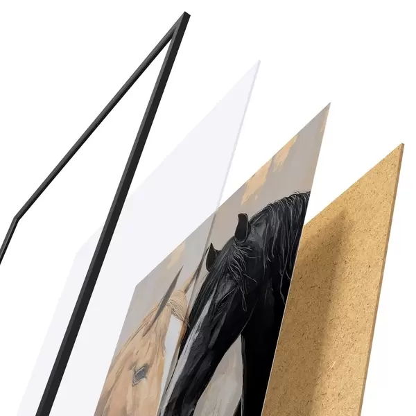 De poster bestaat uit een frame, plexiglas, geprinte afbeelding en spaanplaat achterkant. De poster kan meteen aan de muur worden gehangen dankzij de bevestigingen op de achterkant.
