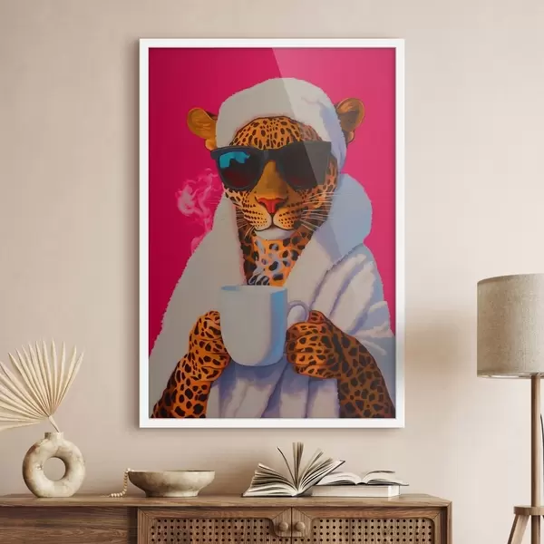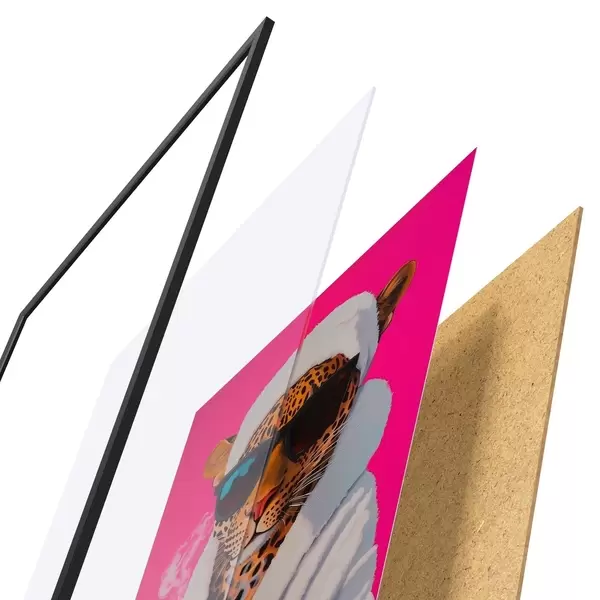 De poster bestaat uit een frame, plexiglas, geprinte afbeelding en spaanplaat achterkant. De poster kan meteen aan de muur worden gehangen dankzij de bevestigingen op de achterkant.