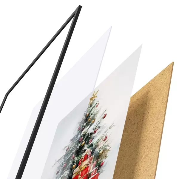 De poster bestaat uit een frame, plexiglas, geprinte afbeelding en spaanplaat achterkant. De poster kan meteen aan de muur worden gehangen dankzij de bevestigingen op de achterkant.