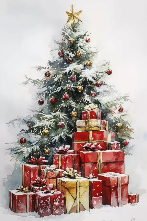 Poster Feestelijke kerstboom met ingepakte cadeautjes, sneeuw, aquarel stijl Nr f41953